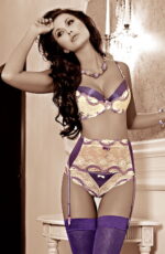 Alegra’s design is wonderfully intricate. A sensational push up bra with a choice of thong or brief along with a beautiful suspender belt all sold as separates. Embellished with cream and purple floral lace embroidery and finished with pretty purple ribbons. Available in cream. Item arrives packaged in its own Roza box.
